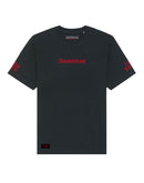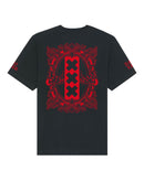 Met een grote rugprint, een subtiele borstprint én twee kleine prints op beide mouwen, is dit shirt tot in de details doordacht. De diepe zwarte kleur vormt een perfect contrast met de rode opdruk, waardoor het design echt tot leven komt.